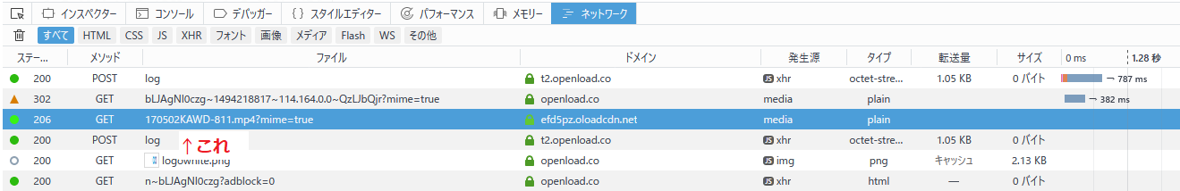 そこに、ステータスが206で、ファイルがxxxxxxxxx.mp4?mime=trueという感じになっているファイルがあるので、このURLをコピー。