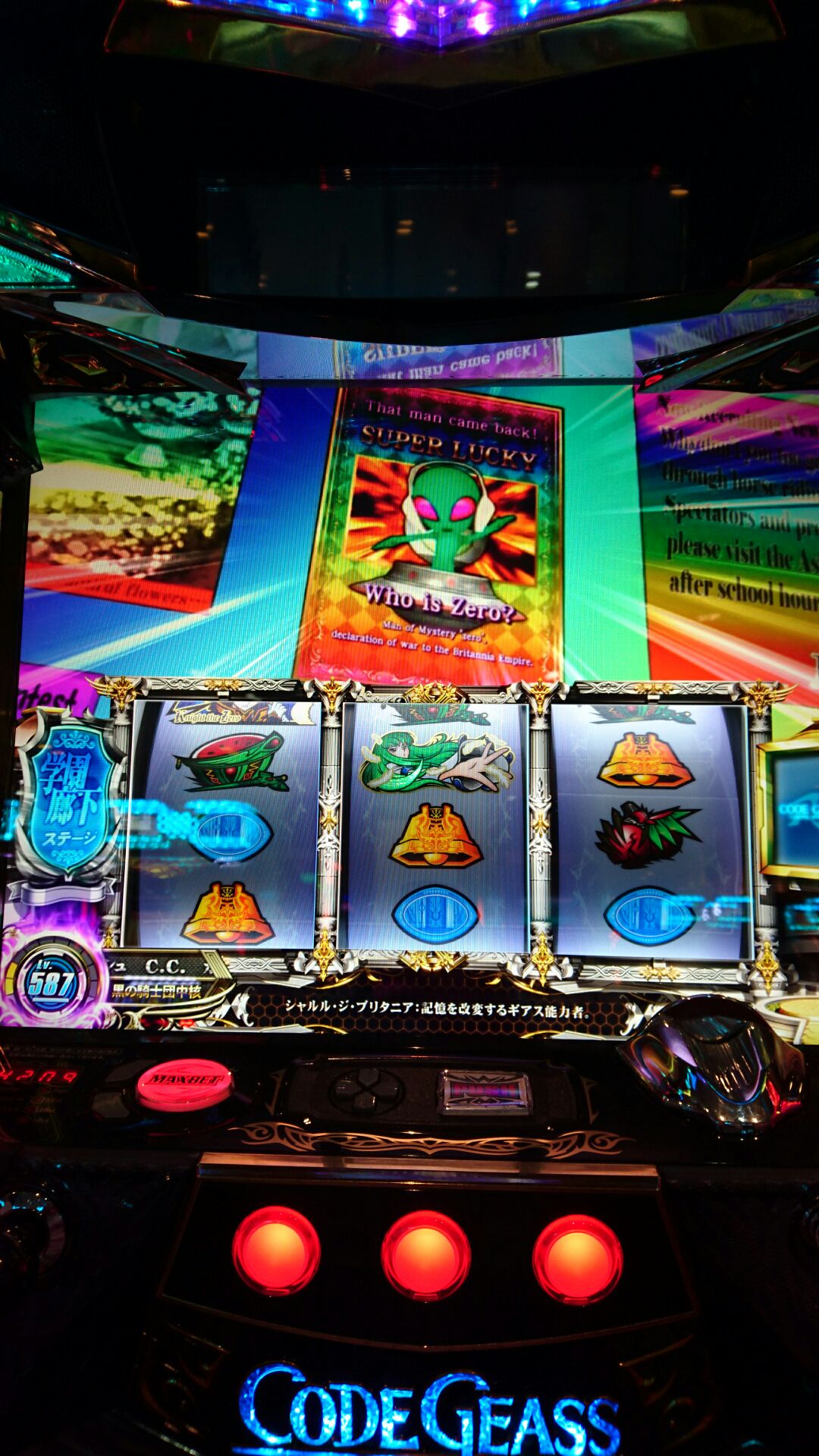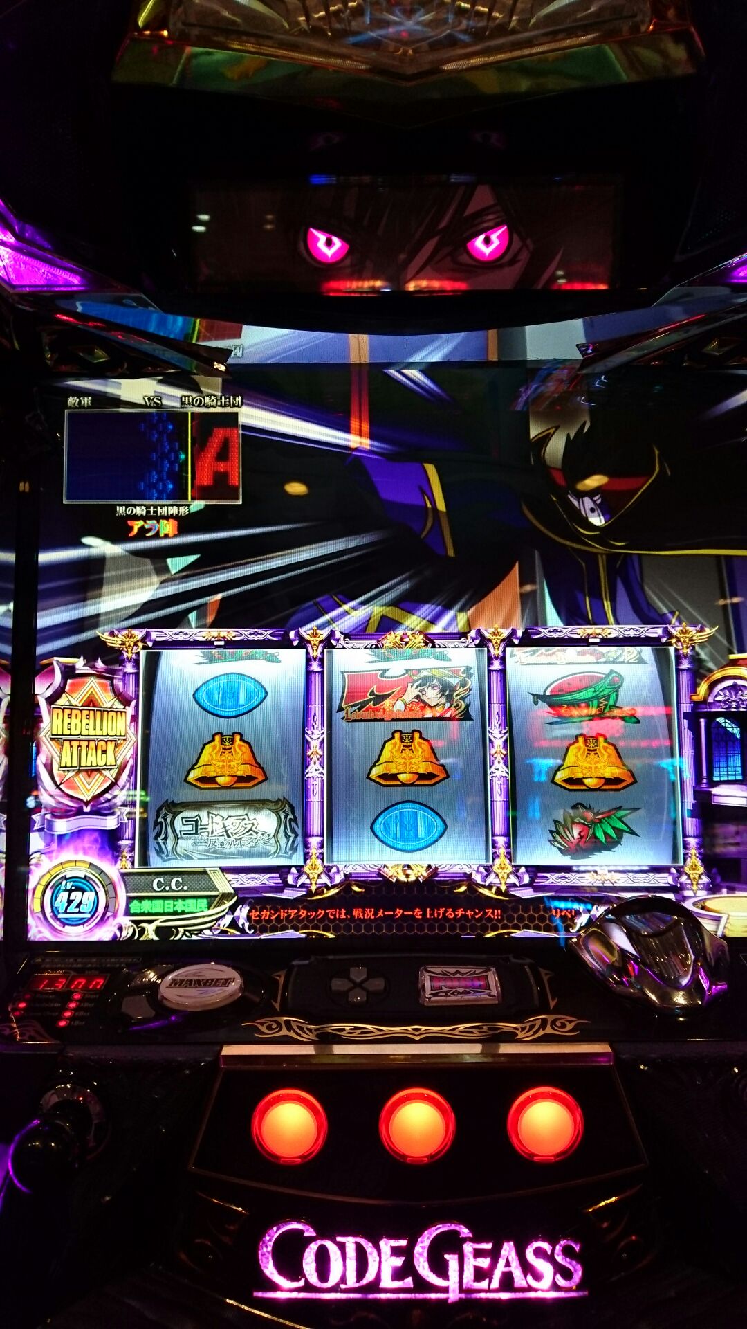 パチスロ コードギアスの筐体上部のルルーシュの目が点滅することあり。