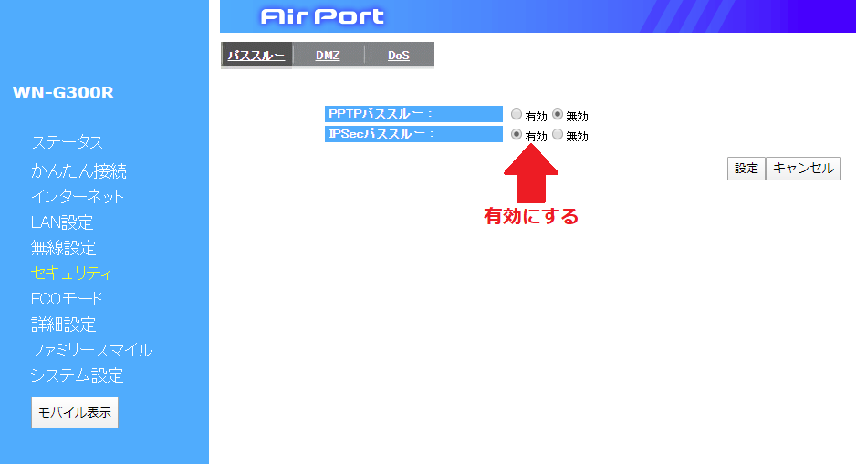 このWN-G300Rですが、デフォルト設定で「IPSecパススルー」が無効になっているようです。